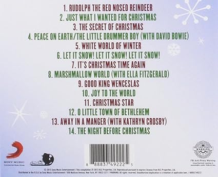 Tracklist 1. Bing Crosby - Rudolph the Red Nosed Reindeer2:082. Bing Crosby - Just What I Wanted for Christmas - available on Sessions2:213. Bing Crosby - Secret of Christmas - available on Sessions2:554. Bing Crosby - Peace on Earth/The Little Drummer Boy - available on Sessions2:375. Bing Crosby - White World of Winter - available on Sessions2:126. Bing Crosby - Let It Snow! Let It Snow! Let It Snow!2:147. Bing Crosby - It's Christmas Time Again2:488. Bing Crosby - Marshmallow World2:509. Bing Crosby - Good King Wenceslas2:3810. Bing Crosby - Joy to the World1:4411. Bing Crosby - Christmas Star2:3112. Bing Crosby - O Little Town of Bethlehem1:2413. Bing Crosby - Away in a Manger1:2414. Bing Crosby - Night Before Christmas3:19